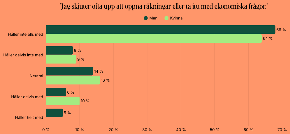 De flesta upplever alltså att de inte ägnar sig åt ekonomiskt undvikande, men ungefär var tionde respondent känner igen sig tydligt i att skjuta upp räkningar och ekonomiska beslut.