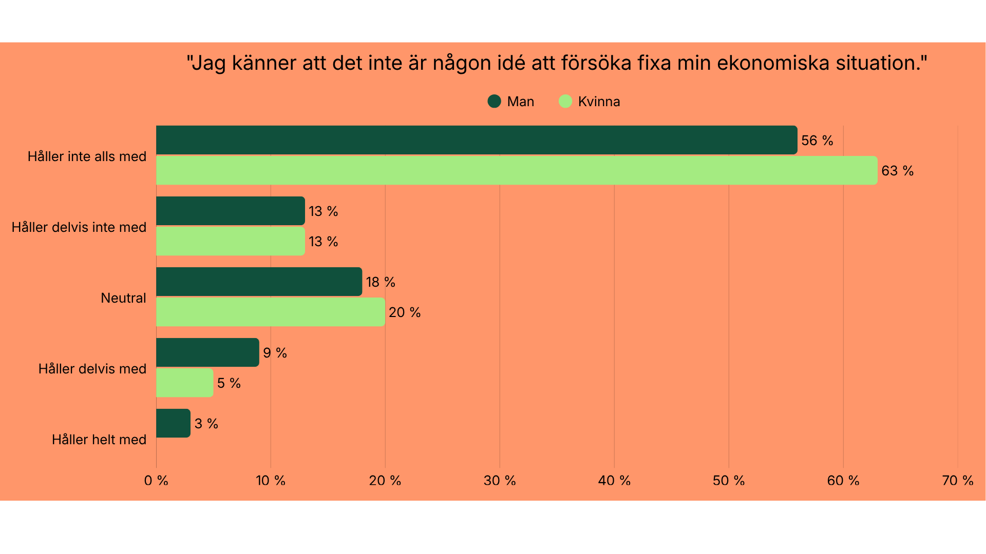 Majoriteten ser alltså inte sin situation som nära “botten”. Samtidigt är det en mindre men betydande grupp, cirka var tionde, som upplever att de befinner sig i ett läge där ekonomin känns så pressad att de vill ge upp eller börja om.